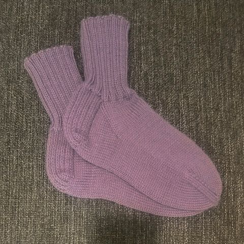 Lyhytvartiset harmaat villasukat oransseilla raidoilla. Neulottu Nalle-langasta (75% villaa, 25% polyamidia). Koko 39 kieppeillä.