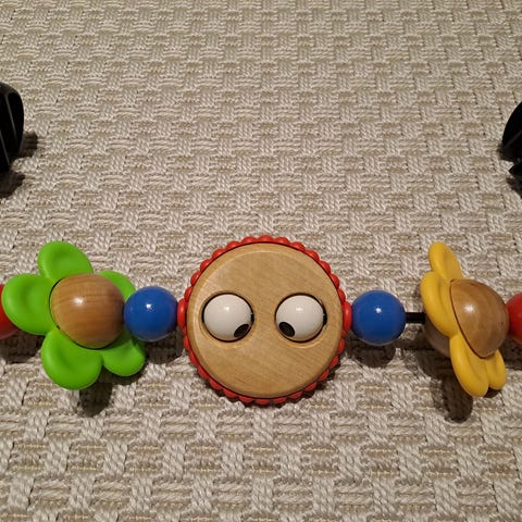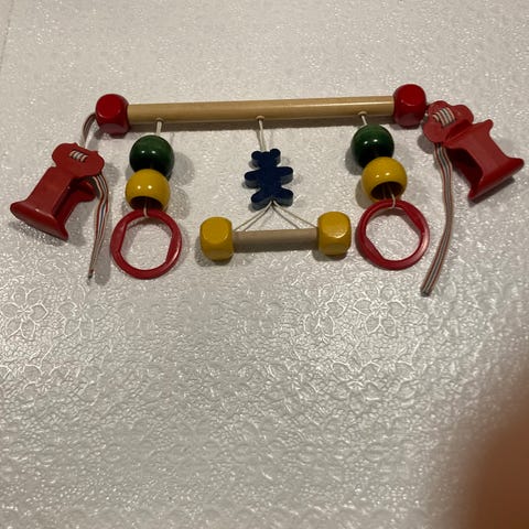 Käytetty lelukaari silti ihan siistissä kunnossa, ajaa asiansa. Helppo kiinnittää sitteriin, osat pyörivät. Tarkkaan tutkiessa huomaa että edellinen omistaja vahvistanut silmien väritystä