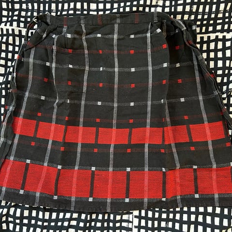 Ehjä ja muuten siisti itse ommeltu essu, mutta pesunukkaa löytyy kun läheltä katsoo. Yleisilme siisti. Röyhelö esiliina. Takana solmittava nauha.
