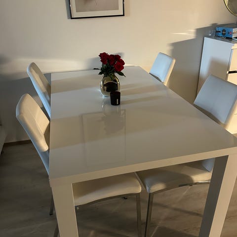 Myydään valkoinen 6 hengen ruokapöytä, mitat 180 x 90 cm.