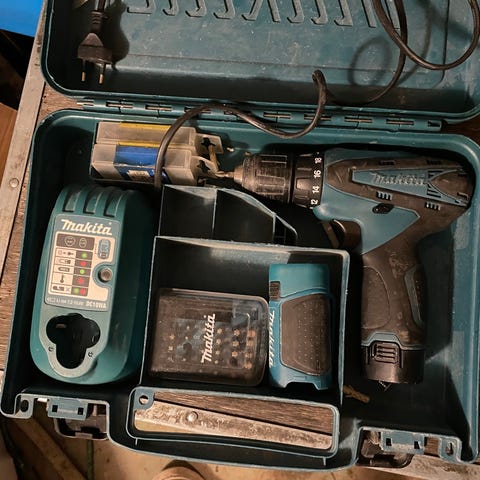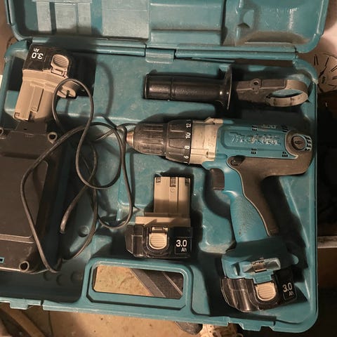 Makita Akku-ruuvinväännin, 18v. Mukana kolme akkua, taskulamppu ja laturi.