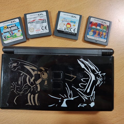 Nintendo DS Lite pelilaite musta väri. Kannettava pelikonsoli, jossa on kaksinäyttöinen rakenne ja kosketusnäyttö. Mukana USB-latauskaapeli ja suojakotelo.mukaan myös lego harry potter peli.