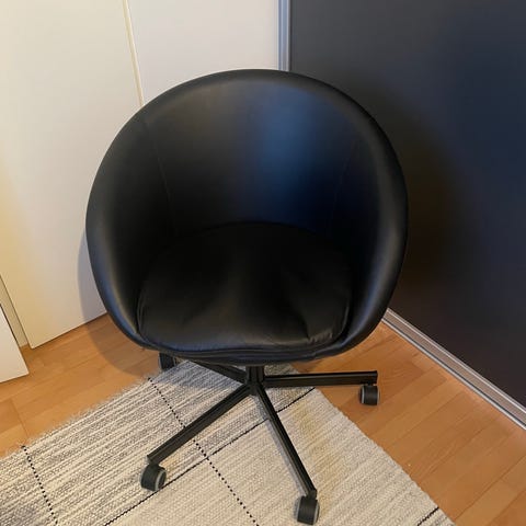 Valkoinen Ikea Skruvsta työtuoli, jossa korkeussäätö. Täysin ehjä, joskin tuolissa paikoin värjäymää käytön jäljiltä.