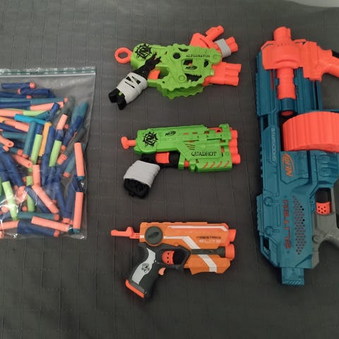 Lapsuuden nerf leikkiaseet, mitä ei ole tullut enää käytettyä. Pyssyt ovat kunnossa ja toimivat vielä hyvin. Muutama naarmu saattaa toki löytyä, kun on joskus ulkona niillä leikitty, mutta ei mitään isompaa ja ei varmasti vaikuta leikkeihin tai kenties keräilyyn.