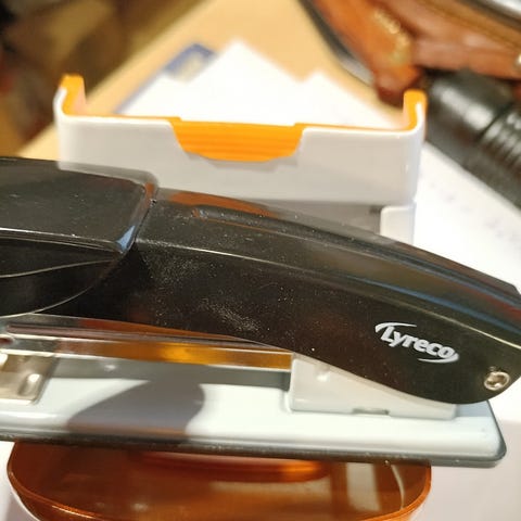 Leitz rei'itin ja nitoja, oranssi rei'itin ja musta nitoja. Toimivat paperin rei'ittämiseen ja niputtamiseen.
