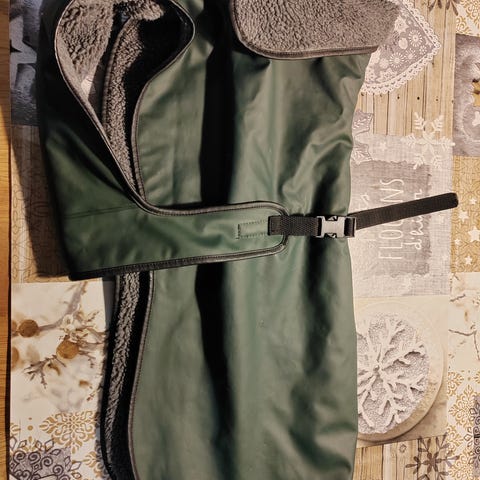 Hyväkuntoinen sadeloimi. Konepesty ennen myyntiin laittamista ja pesun yhteydessä loimeen tuli pientä värjäymää, näkyy kuvassa.