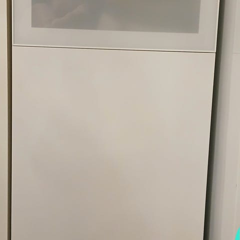 Puunvärinen runko, valkoiset ovet. Koostuu kolmesta palasta, keskellä 120x42x64 ja molemmilla sivuilla 60x42x64. Neljä puun väristä ja kaksi lasihyllyä. Puun väriset jalat.