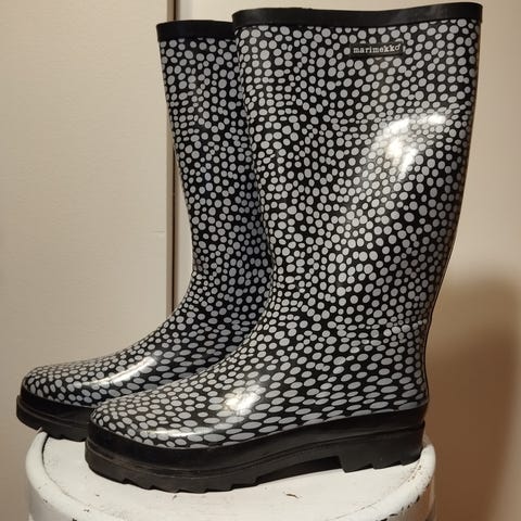 Uudet, Marimekon käyttämättömät kumisaappaat numero 43 Pirput Parput kuviolla. Kokoelmasta vuosilta 2007/2008 (?)