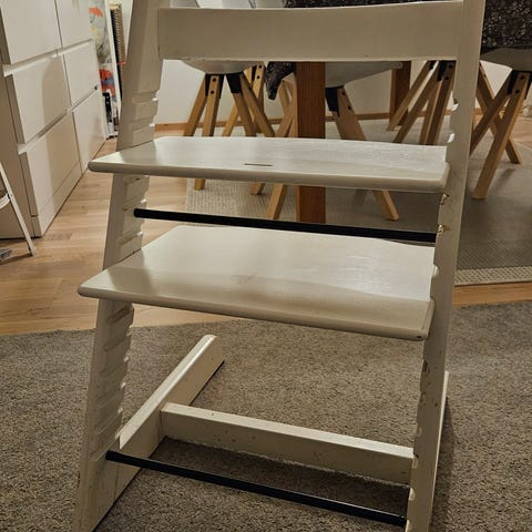 Myydään hyvässä kunnossa oleva Stokke Tripp Trapp syöttötuoli. Tuoliin saa halutessaan mukaan puusepällä mittatilauksena teetetyt korokepalat, joten tuoli soveltuu myös 90 cm korkealle saarekkeelle Tuolissa on säädettävät istuin- ja jalkatuet, jotka mahdollistavat tuolin käytön eri ikäisille lapsille.