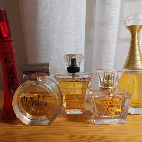 Myynnissä kuvissa näkyvät tyhjät, sekä vajaat naisten hajuvedet yhteishintaan 30€. Kuvista näkee osan pulloista täyttöasteen.