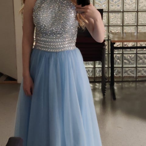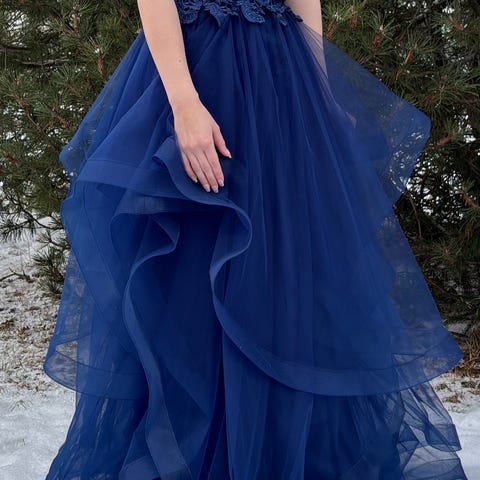 Ilta- tai juhlapuku sinisenä, naisten koko S. Mekko on suunniteltu juhla- ja iltatilaisuuksiin, ja siinä on säädettävät olkaimet sekä leveä helma. Väri on sininen, ja materiaali sisältää kimaltavia yksityiskohtia. Omistaja 162 cm - tanssinut tennareilla. Pidetty päällä yhden päivän.