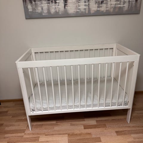 Vauvan pinnasänky, korkeus 78cm (laidan korkeus 45cm), pituus 84cm, leveys 59cm. Vaaleansininen. Pituus säädettävissä suuremmaksi. Pientä kulumaa maalipinnassa.