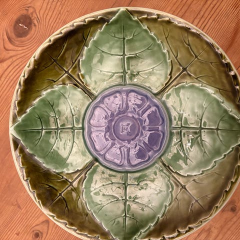 Seinälautasena säilytetty upea kahvallinen jugend-lautanen (1890-1910) majolikaa, aiheena tulppaanit. Lautasessa on 2 kolhu seinälle kiinnikkeenä olleesta metallipidikkeestä. johtuen. Lautasen halkaisija 28 cm. Soveltuu edelleen koriste- tai tarjoiluastiaksi. Hinta yli 100-vuotiaalle antiikkilautaselle 50e.