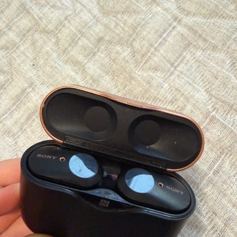 Sony nappikuulokkeet harmaassa värissä, mukana latauskotelo.