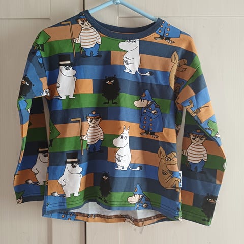 Myydään värikkään raidallinen poikien muumikuviolla oleva pitkähihainen pusero. Merkki Moomin