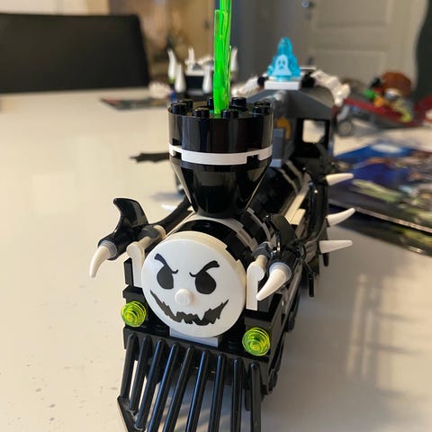 Setissä on mukana pimeässä hehkuvia osia (luurangon pää, hämämäkki ja rotta) sekä valopalikka (54930c01), joka tarvitsee uuden patterin toimiakseen (2x LR41 1.5V)