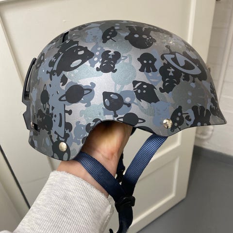 Siitä otsikon ja kuvien mukainen pari kertaa käytetty kypärä seuraavalle polkijalle.