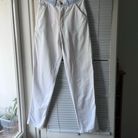 Farkuissa on vetoketjukiinnitys (nappi puuttuu), ja etureiden kohdalla on tahra (ks. kuvat), muuten kunnossa ei ole valittamista. Materiaali on hyvin joustavaa ja ryhdikästä stretch-denimiä, joka istuu mukavasti mutta pitää muotonsa.