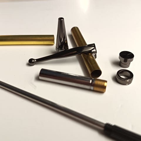 Koristeellinen kynä hopeanvärisellä kahvalla ja valkoisella rungolla. Kynä on esitetty alkuperäisessä pakkauksessaan, joka sisältää myös musteen täyttöosat.
