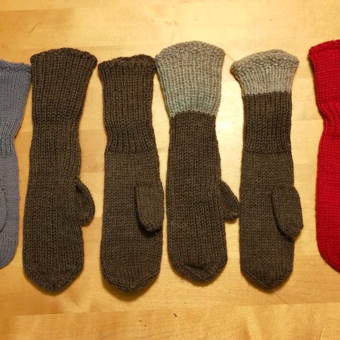 Ylärivin harmaat sukat täysin ehjät. Alarivin sukissa ohentumaa kantapäissä. Joissakin sukissa on teipin jäljet varren sisäpuolella nimikoinnista. Sukissa on merinoille tyypillistä nyppyä.