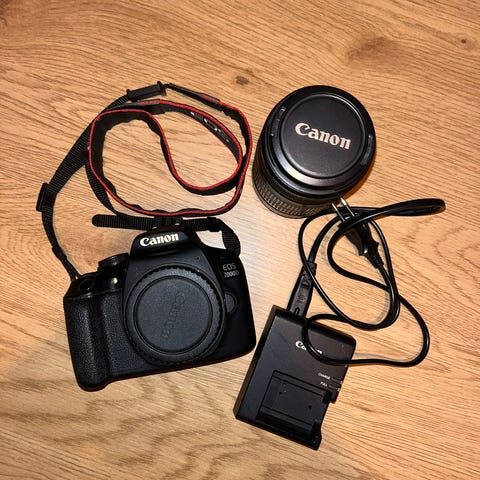 Canon EOS 2000D digitaalikamera, mukana 18-55mm objektiivi, laturi, USB-kaapeli, Manfrotto laukku ja Nissin Speedlite Di622 -salama. Kamerassa on Canonin valmistama kenno ja se soveltuu valokuvaukseen erilaisissa olosuhteissa.