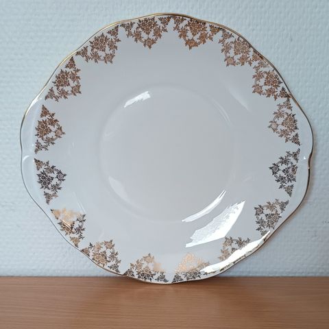 Lautasen takapuolella on kruunuleima ja teksti: Bone China H 17 8, Queen Anne, Made in England, A product of ridgway potteries Ldt.