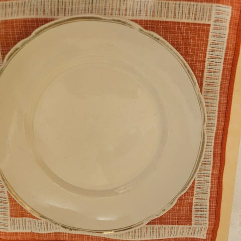 Siisti ja hyväkuntoinen lautanen, keskellä näkyy muutamia hienon hienoja aterimista tulleita naarmuja.