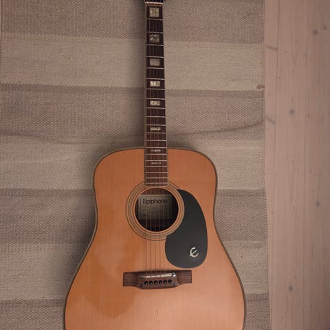 Hyvillä virittimillä, satulalla ja tallalla varustettu hyväsointinen Epiphone akkari halvalla