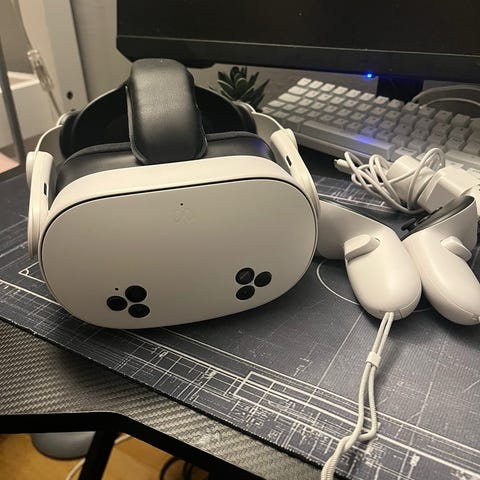 Tällähetkellä kiinni BOBOVR E3 pääpanta niin on mukavempi käyttää mutta mukaan saa alkuperäisen pannan, yhdet paristot ohjaimiin, VORTEXVR 3m link kaapelin sekä tarvittaessa 20000mAh virtapankin josta voi latailla samalla kun pelaa standalone tilassa.