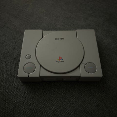 Playstation classic konsoli ja ohjaimet alkuperäisessä laatikossa.