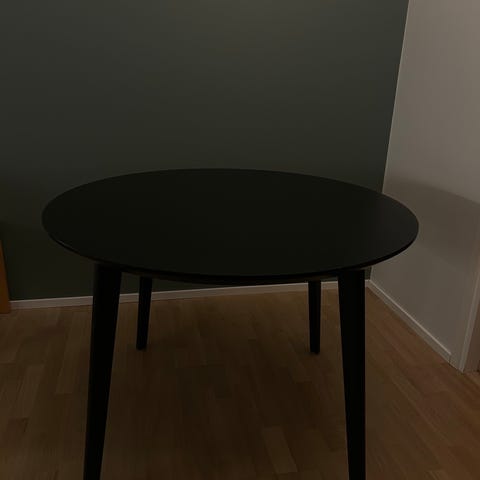 Pyöreä pöytä, jossa on musta kiiltävä lasitaso ja metalliset jalat. Pöydän jalat ovat suorat, mikä antaa sille modernin ilmeen. Pöytälevy on sileä ja yksinkertainen, mikä tekee siitä monikäyttöisen huonekalun moneen tilaan.