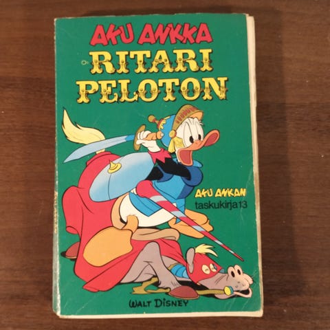 Aku Ankan taskukirja numero 13, Aku Ankka Ritari Peloton, neljäs painos. Sarjakuva hyvässä ikäisekseen kunnossa pinnoiltaan.