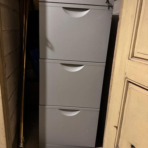 Aristo metallinen arkistokaappi, jossa on neljä laatikkoa. Mitat noin 130korkea ja 70syvä