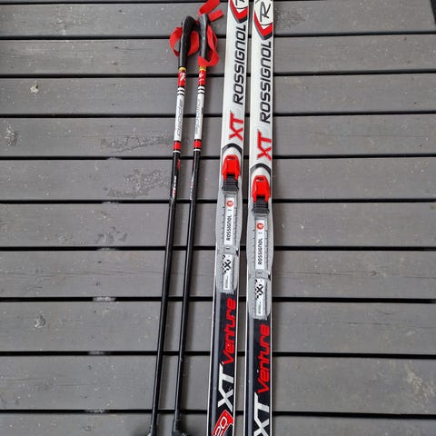 Kohtalaisessa kunnossa olevat sukset, käytönjälkiä ja toisesta suksesta hieman kanta repsottaa, mutta ei ole vaikuttanut meidän käyttöön.
