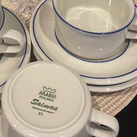Myydään vielä kaksi kpl Arabia Saimaa teekuppeja ja tasetit.