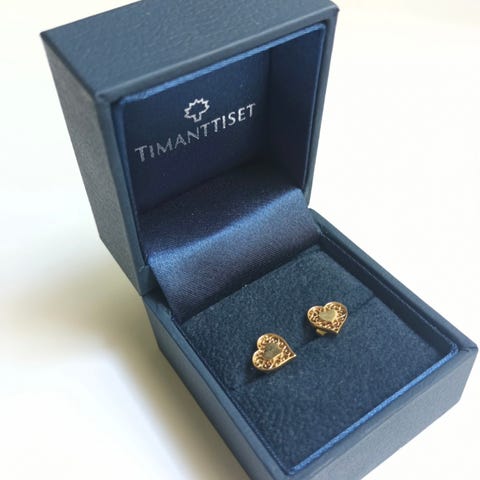 Näissä valkokultaisissa läpi korvan korvakoruissa on rivi aitoja timantteja.