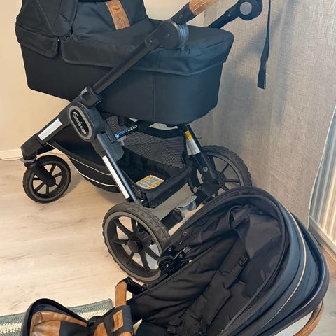 Emmaljunga NXT90 -vaunut white leatherette -nahkakankaalla, sis. rungon, black outdoor -renkaat, ergo-istuimen ja kopan. Runko musta, tyylikäs nahkainen työntöaisa.