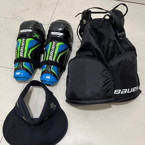 Hyväkuntoiset housut, tarrat pitää hyvin, olleet yhdellä käytössä. Näihin saa Bauerin sukat kiinnitettyä tarroilla. Irrotettava muovinen alasuoja. Minusta pientä kokoa, meidän 133 cm pitkälle normaalivartaloiselle tosi napakat.