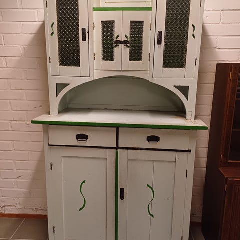 Hieno vanha kaappi. Kaikki ovet ja laatikot aukeavat hyvin, mutta vain osa avaimista on enää tallella.