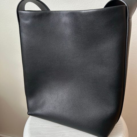 Uutta vastaavassa kunnossa. Magneettinappi kiinnitys, sisäosa vuoritettu, sisäpuolella vetoketjutasku. Laukun korkeus 32cm, leveys 25cm, pohjan syvyys 13cm.