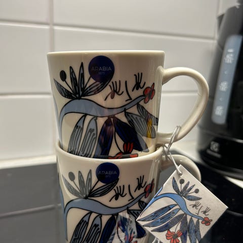 Mukit on olleet käytössä.Mukit ehjät ei rosoja ei lohkeamia.Hallamarja muki korkeus 9 cm,halkaisija 8,5 cm.Kpl/ hinta 35€. Neitoperho muki korkeus 6,6 cm,halkaisija 8,6 cm.Hinta 30€.