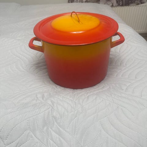 Timo Sarpanevan punainen emalikattila, jossa on puinen kahva. Kattila on valmistettu emalista ja soveltuu ruoanlaittoon. Väri on kirkkaanpunainen. Nouto tai tapaaminen sovitussa paikassa.