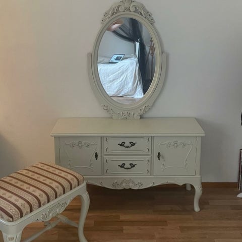 Puusepän käsityönä vaimolleen 60-luvulla valmistama rokokootyylinen kampauspöytäsetti : peili, pöytä sekä jakkara. Peilin voi kiinnittää pöytää tai seinälle. Hyvässä kunnossa. Hinta on koko setille.
