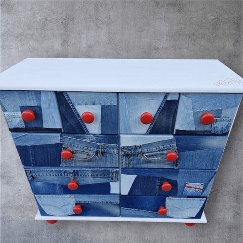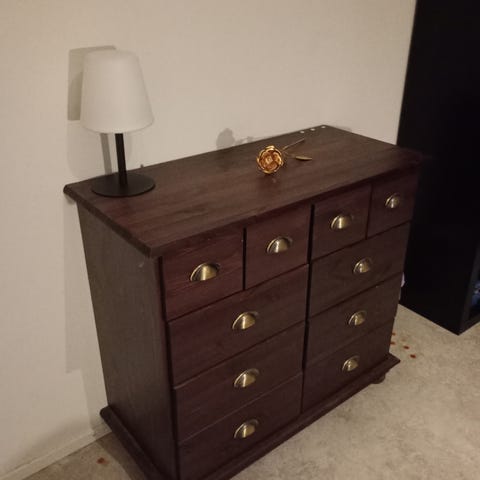 Kaksi kiskoa rikki, hiukan kulmaa kärsitty, muuten ehjä apteekkarin lipasto.