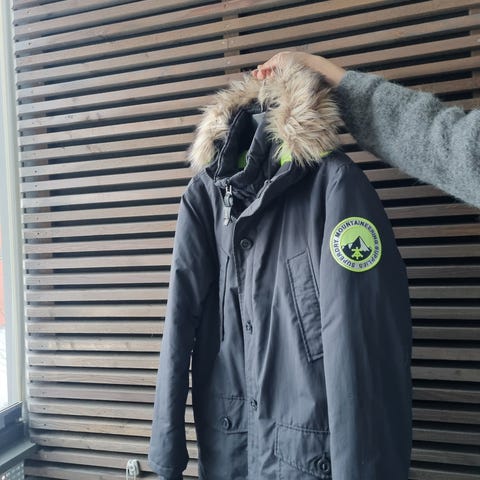 Musta takki miehille, koko L. Valmistettu polyesteristä. Takissa on hupullinen malli ja se soveltuu ulkokäyttöön.