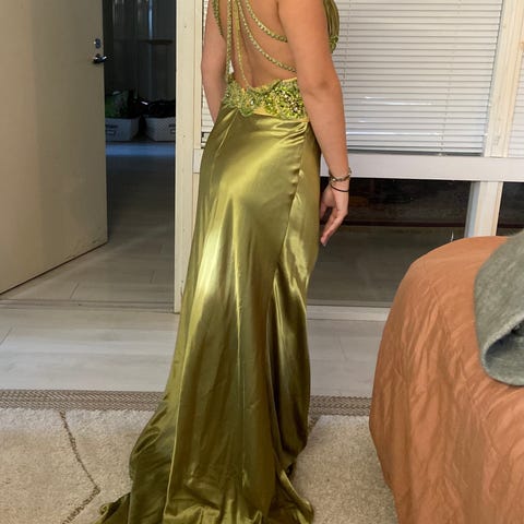 Myydään kaunis tummanvihreä juhlamekko. Mekossa on toppaukset ja mekon keskiosa on joustavaa kangasta joten menee hyvin S/M kokoiselle. Itsellä mekko ylettyi vähän yli nilkkoihin (170 cm)