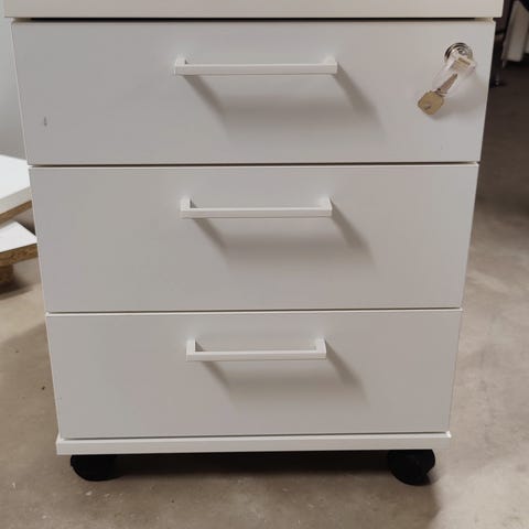 Valkoinen lukittava laatikosto pyörillä ja laatikoilla
