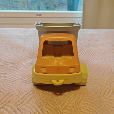 Leikkikuorma-auto, jossa sininen ohjaamo ja keltainen kuormatilaa. Valmistettu muovista. Sopii lasten leikkeihin.