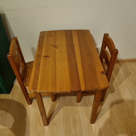 Pieni pöytä ja 2 kpl tuoleja. Jotakin käytön jälkeä, muuten hyväkuntoinen.