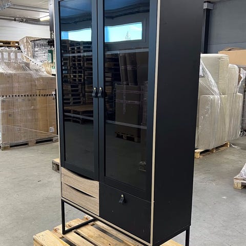 Tyylikäs vitriini lasiovilla, vetolaatikoilla sekä korkeilla metallijaloilla. Siistissä kunnossa, mutta joitain käytön jälkiä löytyy (Kts. kuvat).